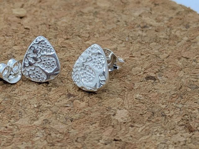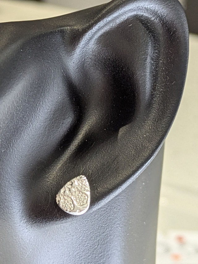 These earrings measure approx 9x7mm. They are designed and handmade in the shape of a drop or a guitar pick with a gentle texutre (the texture may vary from the one shown).