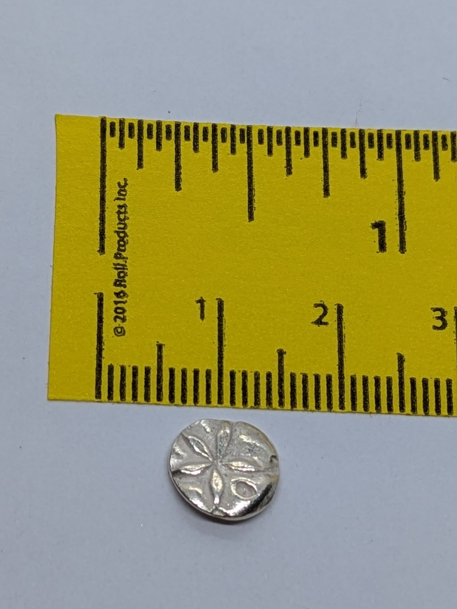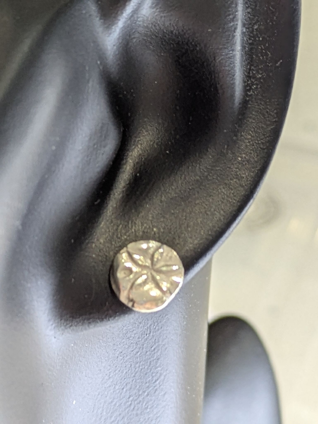 These earrings measure approx 10x10mm. They are designed and handmade in the shape of a sand dollar shell with gentle surface texturing.