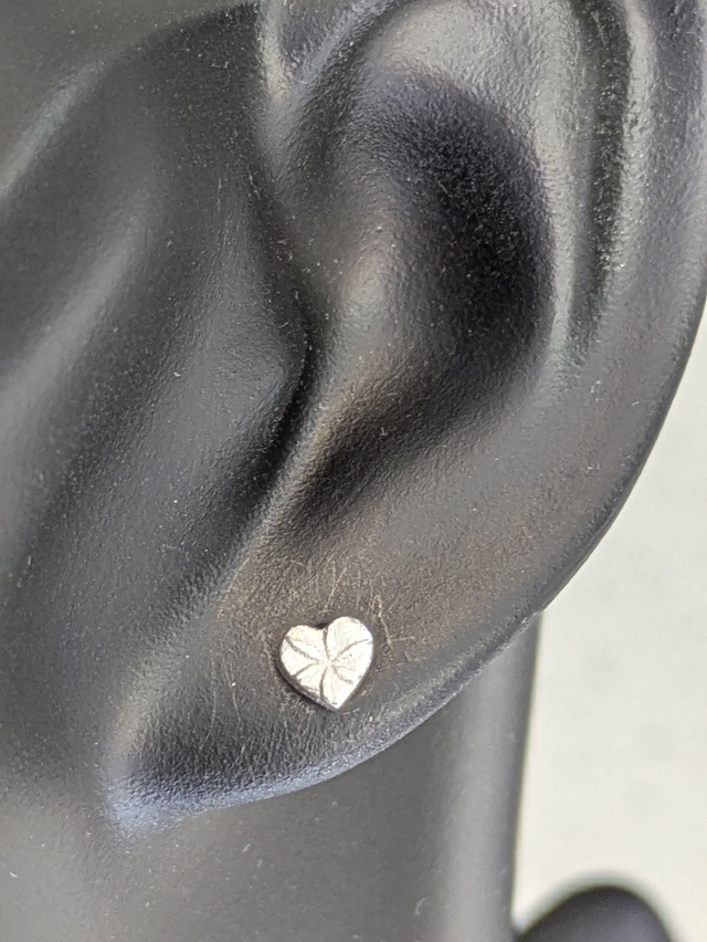These earrings measure approx 5x5mm. They are designed and handmade in the shape of a sweet heart and are finished with a textured design (the texture may vary from the photo).