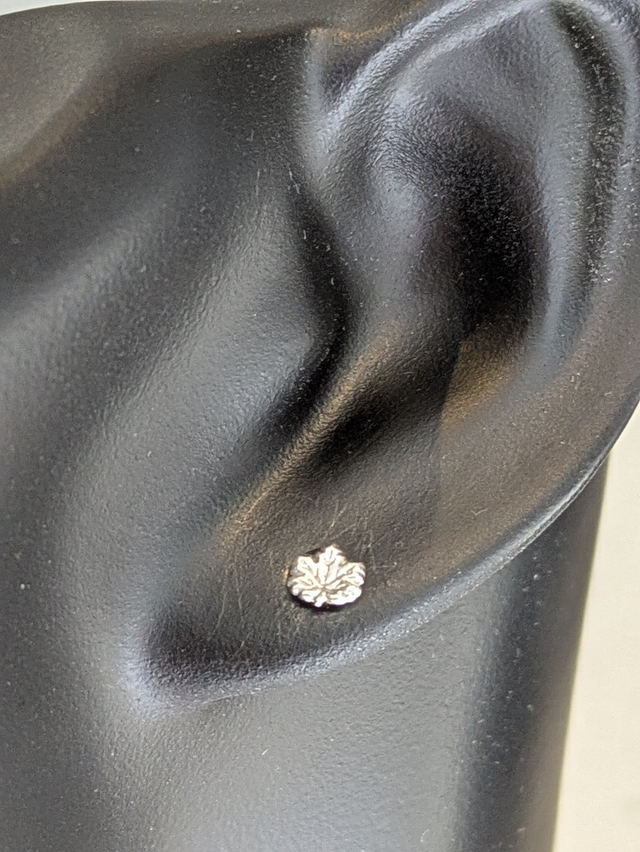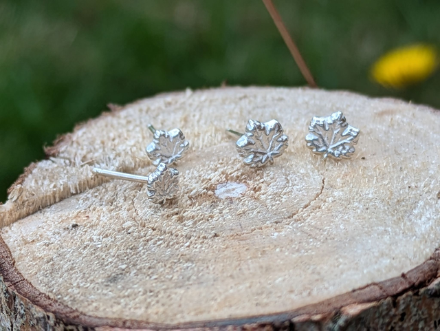 These earrings measure approx 5x5mm. They are designed and handmade in the shape of a maple leaf with a gentle texutre. Also available in Small size.