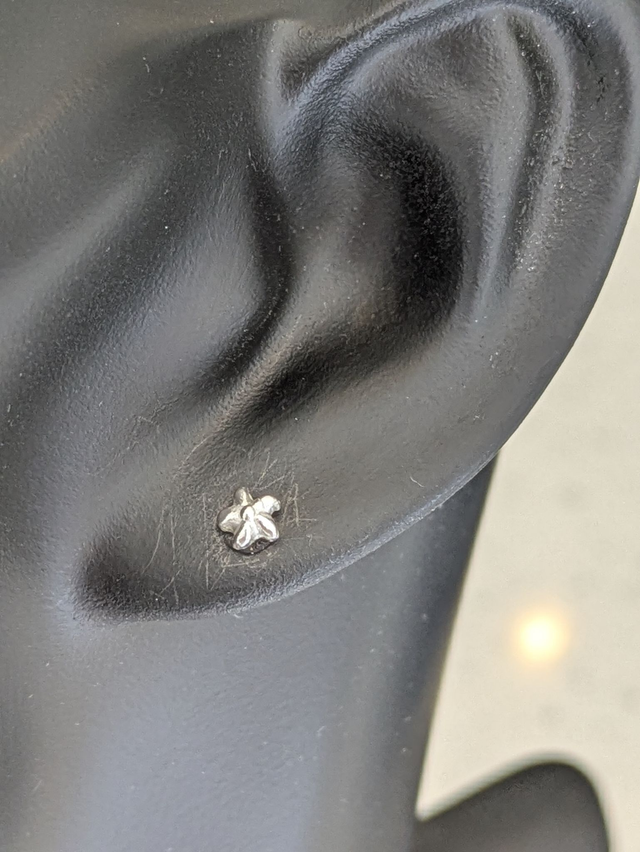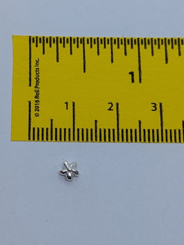 These earrings measure approx 4x4mm. They are designed and handmade in the shape of a flower with 5, star shaped petals and a gentle texutre.